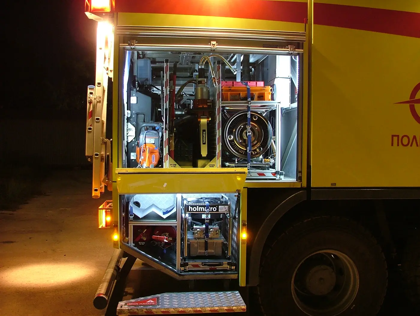 (φάροι/σειρήνες) και ισχυρός Φωτισμός εργασίας (εσωτερικός & εξωτερικός) για επιχειρήσεις νύχτα ή σε συνθήκες καπνού.