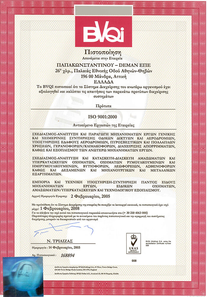 Πιστοποίηση συστήματος διαχείρισης ποιότητας κατά ISO 9001.