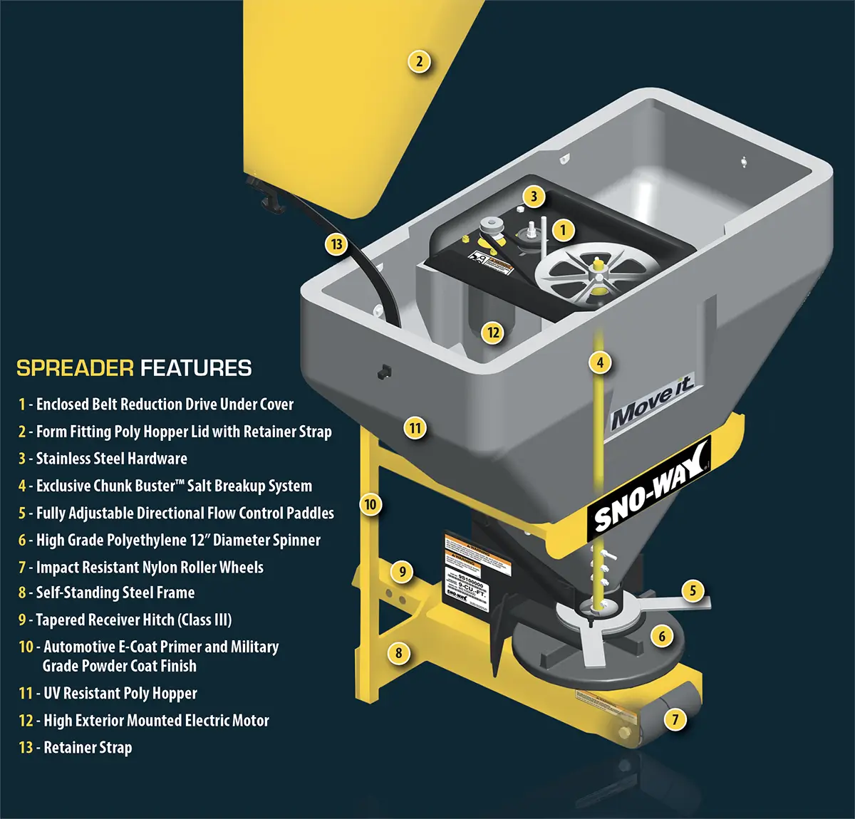 Σας παρουσιάζουμε το μοντέλο Sno-Way® 4 Cu. Ft. Receiver Spreader, ένα αξιόπιστο εργαλείο που θέτει νέα πρότυπα για την ελαφριά επαγγελματική αποπαγοποίηση, με έμφαση στην ανθεκτικότητα και την ακρίβεια.