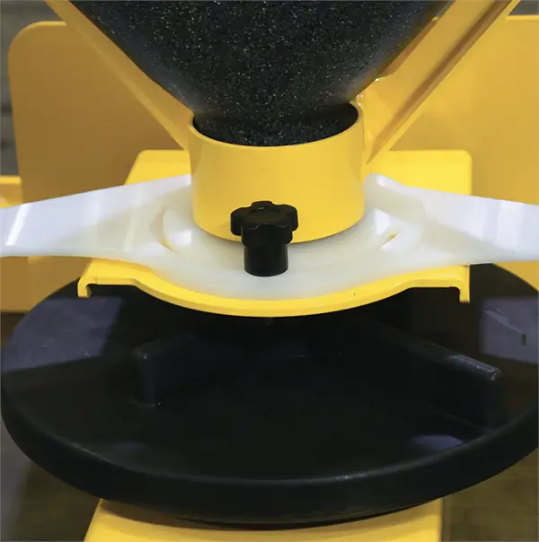 Ο σχεδιασμός του κάδου σε συνδυασμό με την ρυθμιζόμενη παλέτα (paddle) διασφαλίζουν την ομοιόμορφη ροή του υλικού προς τον περιστρεφόμενο δίσκο, αποτρέποντας τα "κολλήματα" ή την ανομοιόμορφη διασπορά.
